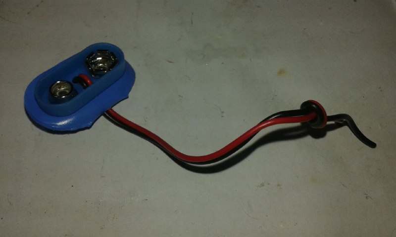 quello del positivo scollegato. Prendi la clip della batteria, eventualmente riduci leggermente la lunghezza dei fili. Salda il filo nero (negativo) al connettore centrale dell'interruttore, e salda insieme il rosso con il positivo rimasto scollegato. Usa un po' di nastro isolante o scotch per isolare quest'ultima connessione. |