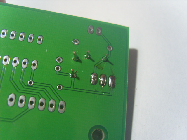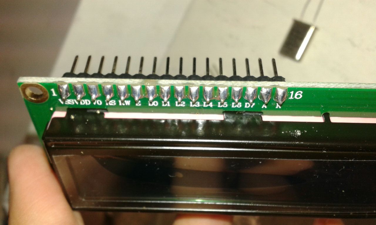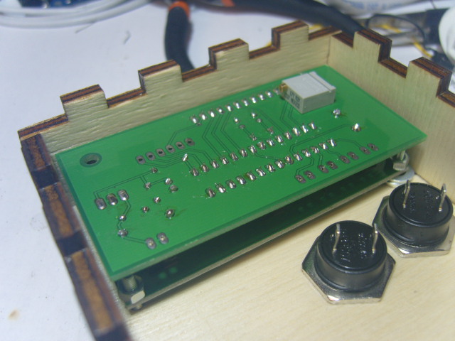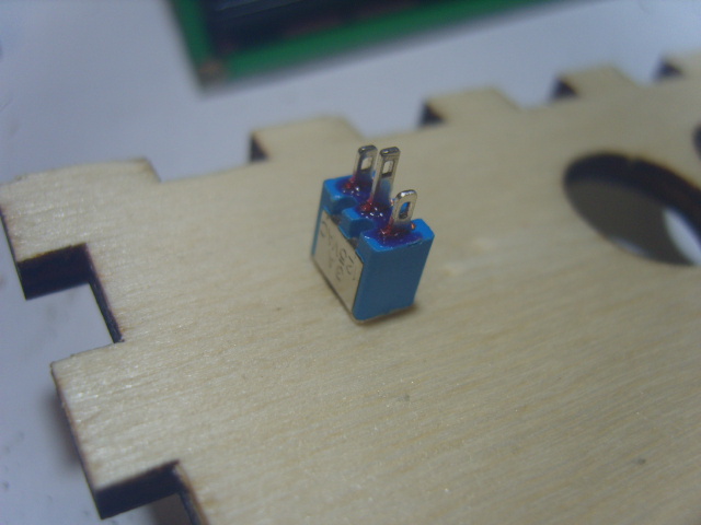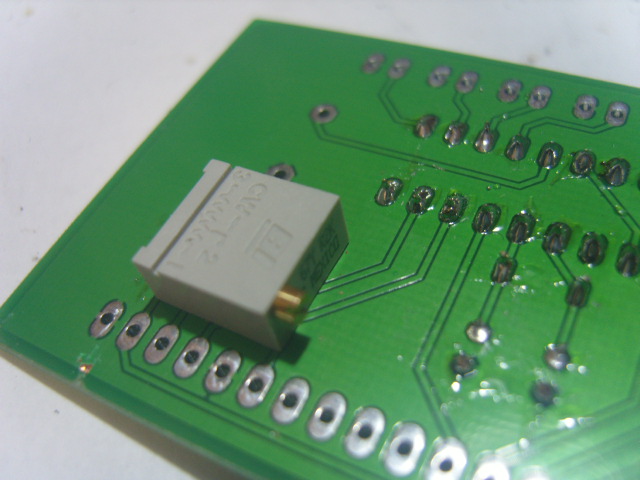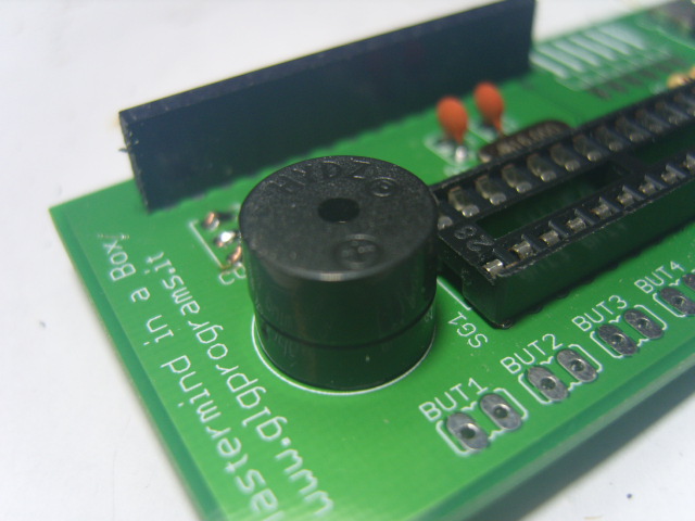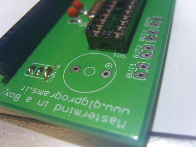Saldiamo adesso la strip del display e il trimmer di calibrazione del contrasto. Consiglio di posizionare il trimmer disteso e sul retro della PCB, in modo da poter compiere le regolazioni più facilmente. | Infine, l'ultimo componente da saldare il buzzer: anche questo componente ha un verso, indicato dal simbolo + sulla PCB. | Il circuito è terminato, restano solo da saldare i connettori (strip) sul display. |