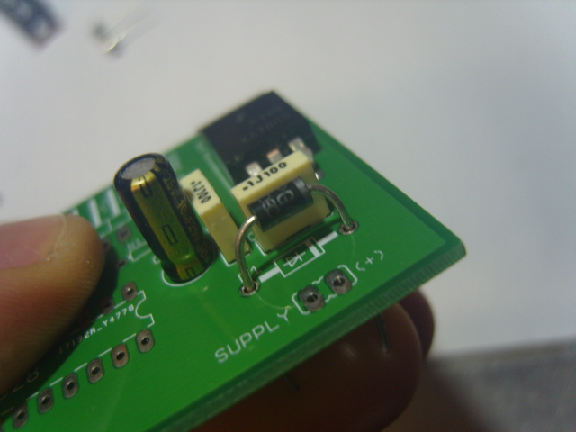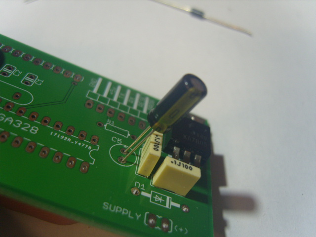 poiché hanno un verso ben preciso da rispettare C5: Condensatore 10uF - Sul corpo del componente è indicato il terminale negativo con una fascia bianca, mentre sulla PCB è indicato il terminale positivo D1: Diodo 1N4001 - La fascia bianca sul componente deve corrispondere a quella sulla PCB |