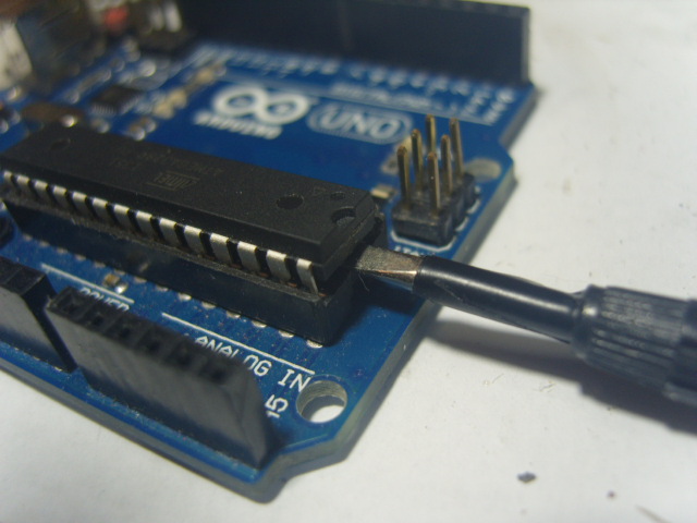 | Resta da programmare l'ATmega: prendi il tuo Arduino e con l'aiuto di un cacciavite a taglio rimuovi l'ATmega328 dal suo zoccolo, dopodiché posizionaci quello del kit. Una volta caricato lo sketch, potrai rimuoverlo e posizionarlo sullo zoccolo del MasterMind. | ||